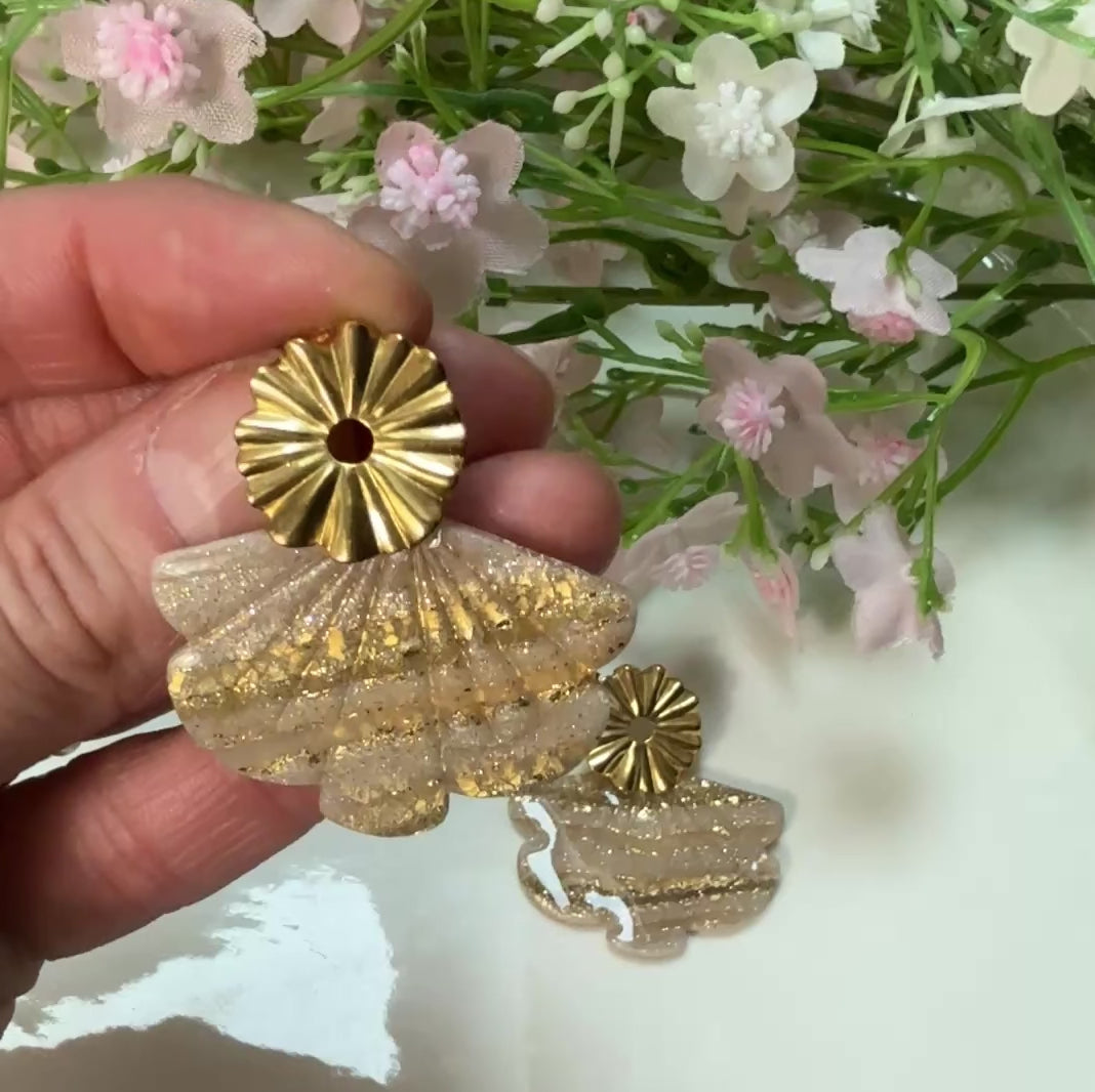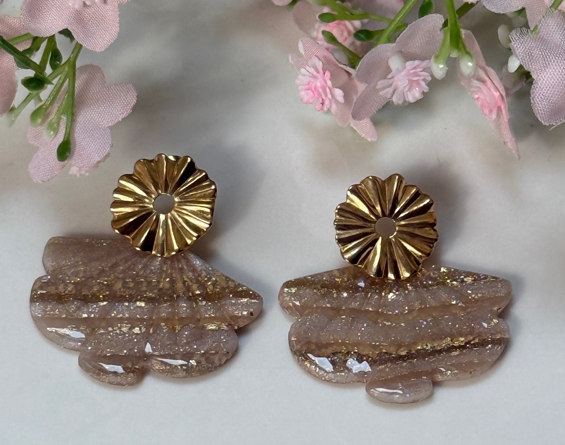 La pièce principale en éventail est en argile polymère ,celles-ci sont montées sur une puce d'oreille en acier inoxydable.