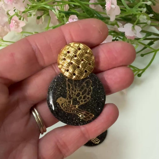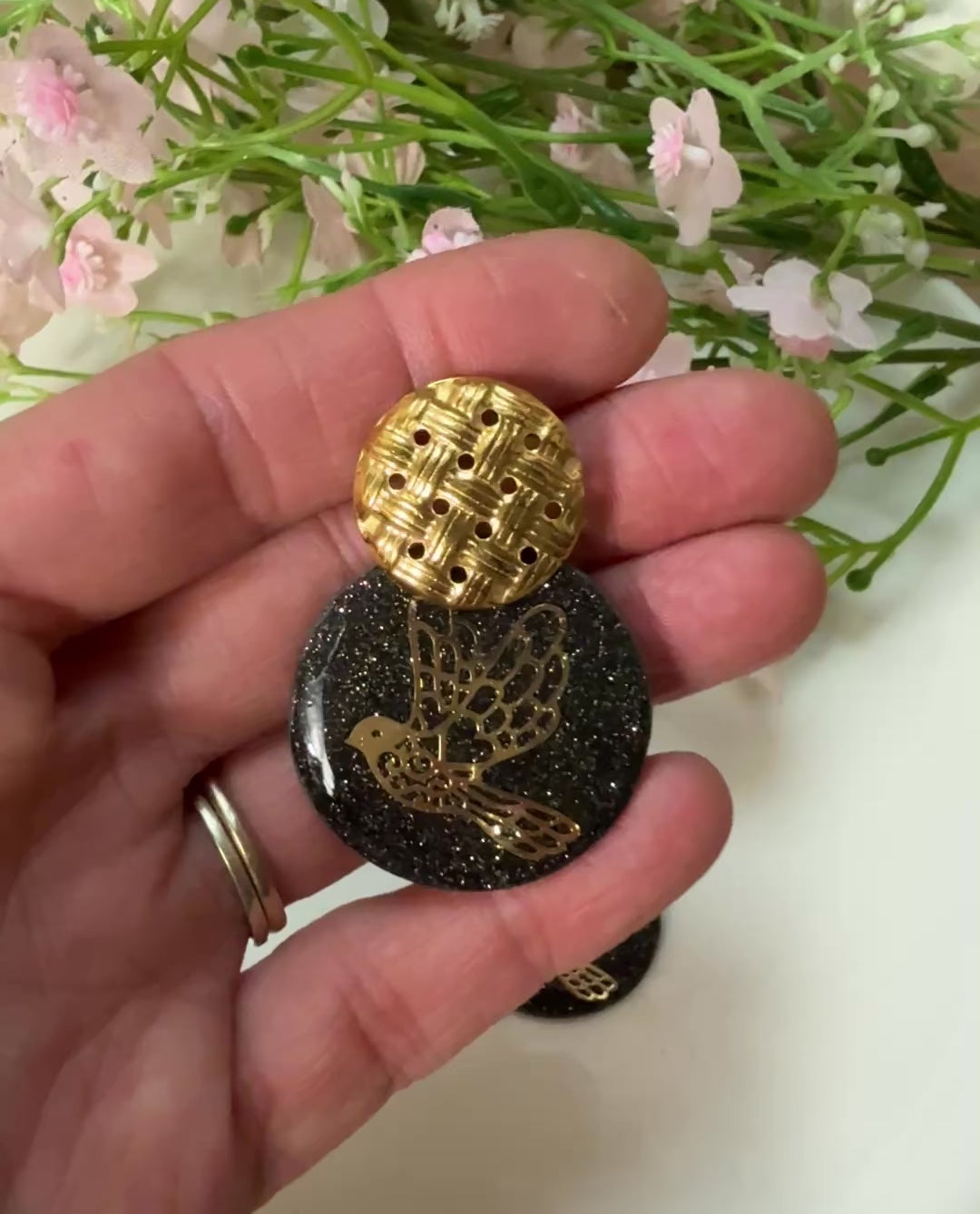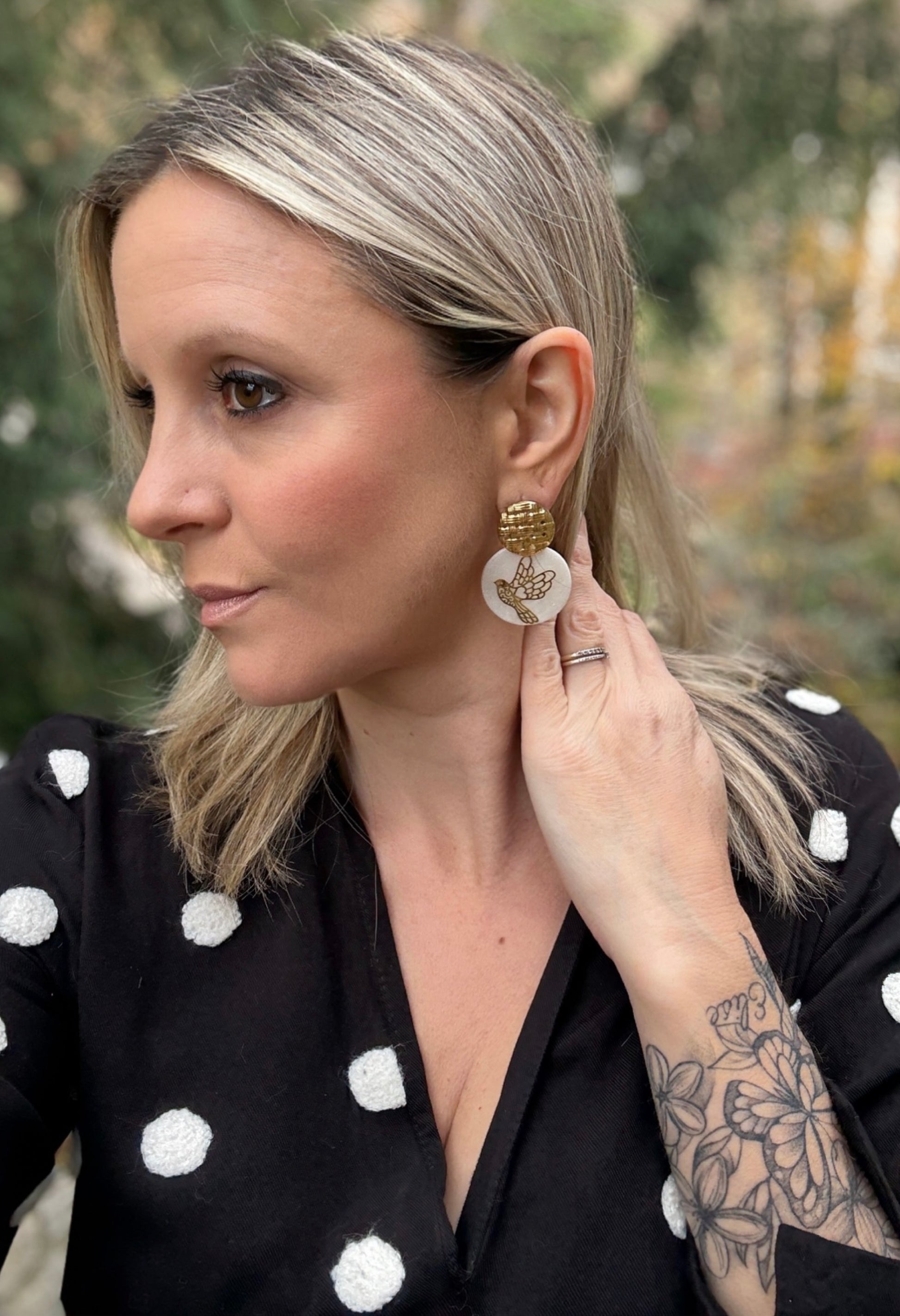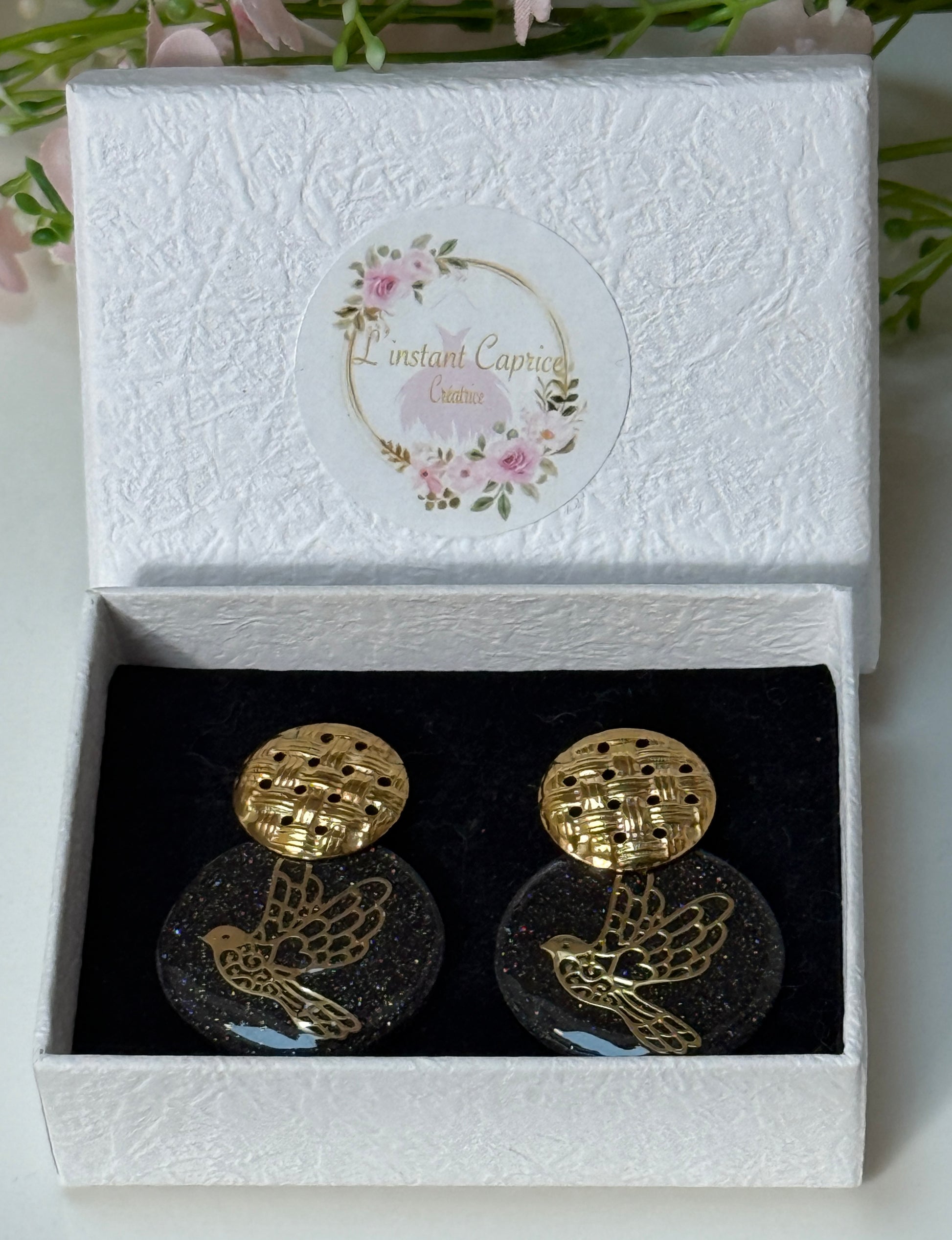 La pièce principale est en argile polymère avec en sont centre une petite colombe, celles-ci sont montées sur une puce d'oreille en acier inoxydable.