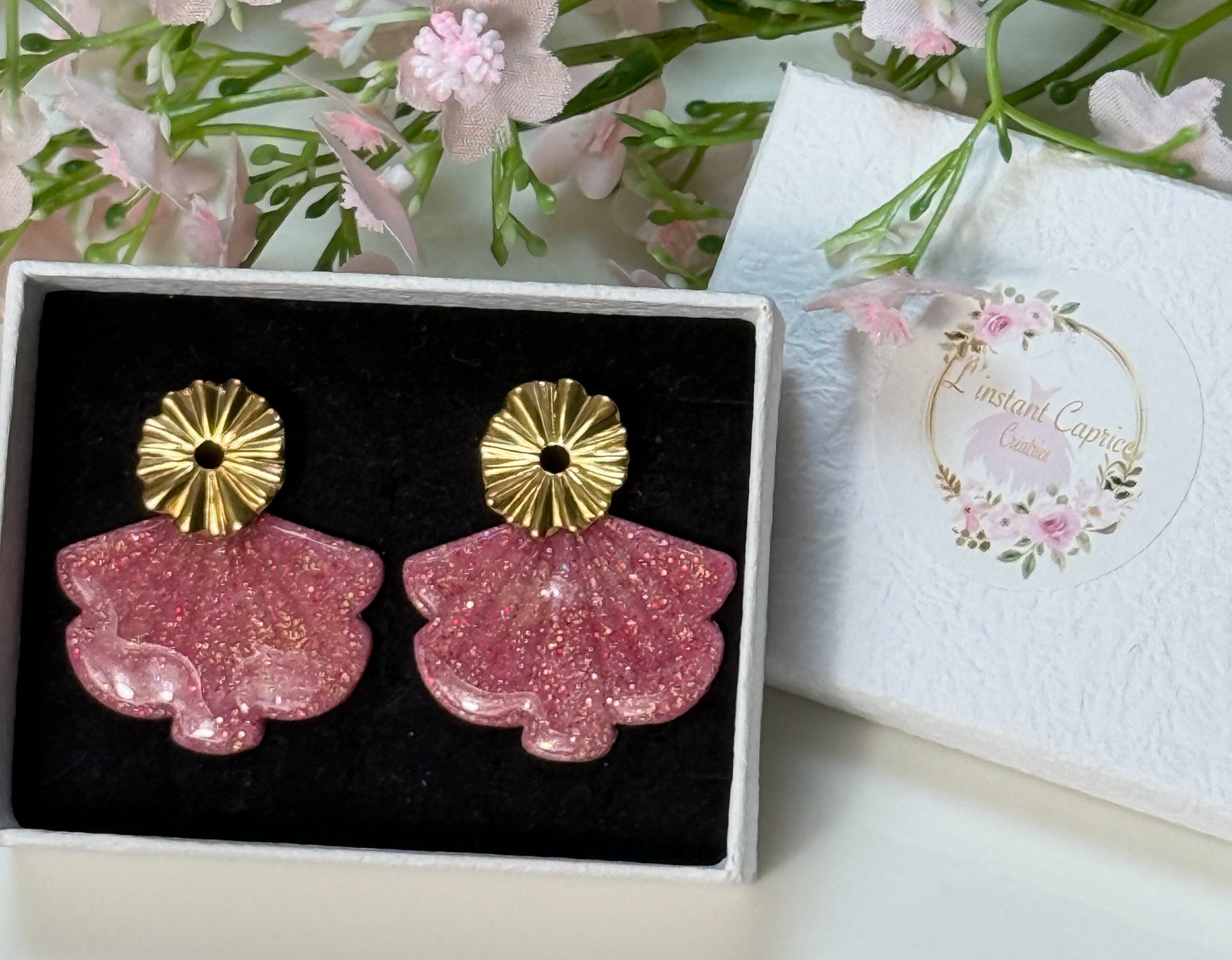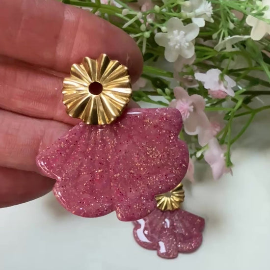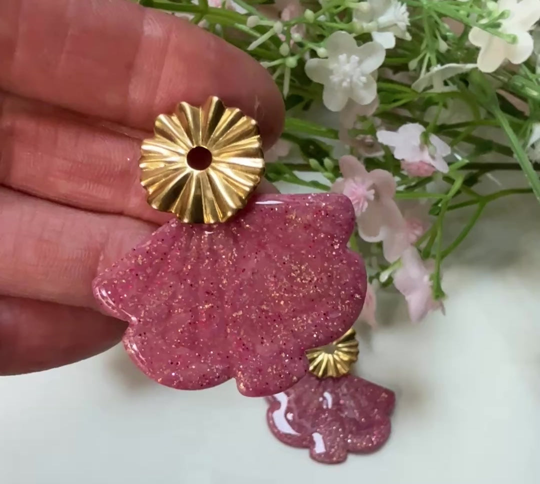La pièce principale en éventail est en argile polymère ,celles-ci sont montées sur une puce d'oreille en acier inoxydable.