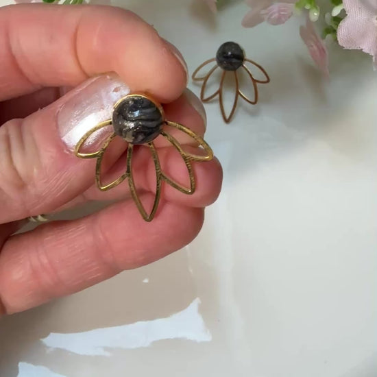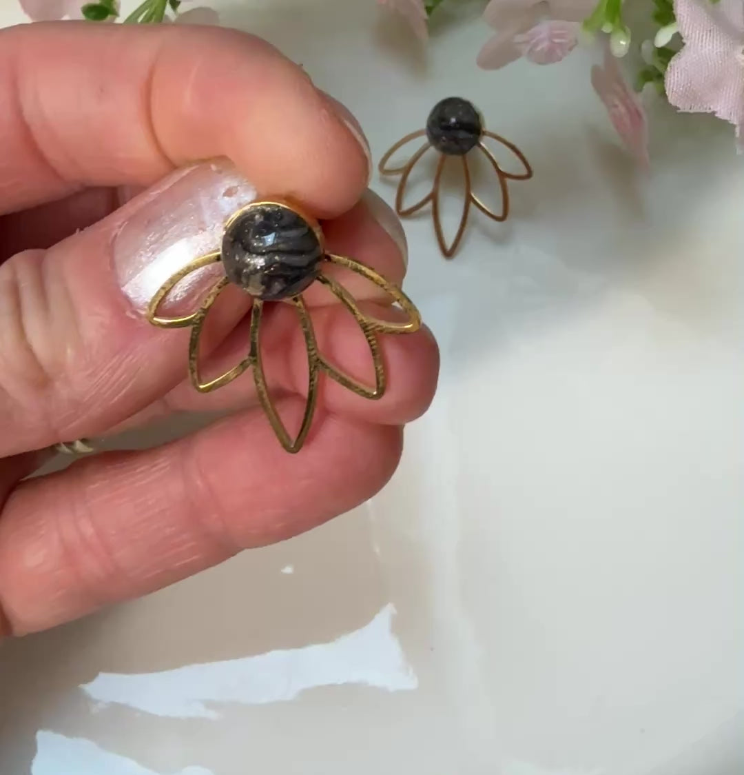 Une magnifique paire de boucles d'oreilles en acier inoxydable avec sa petite perle en argile polymère et résine.