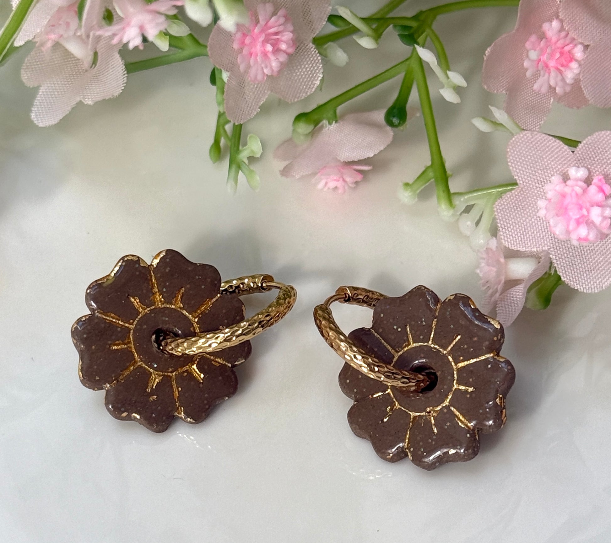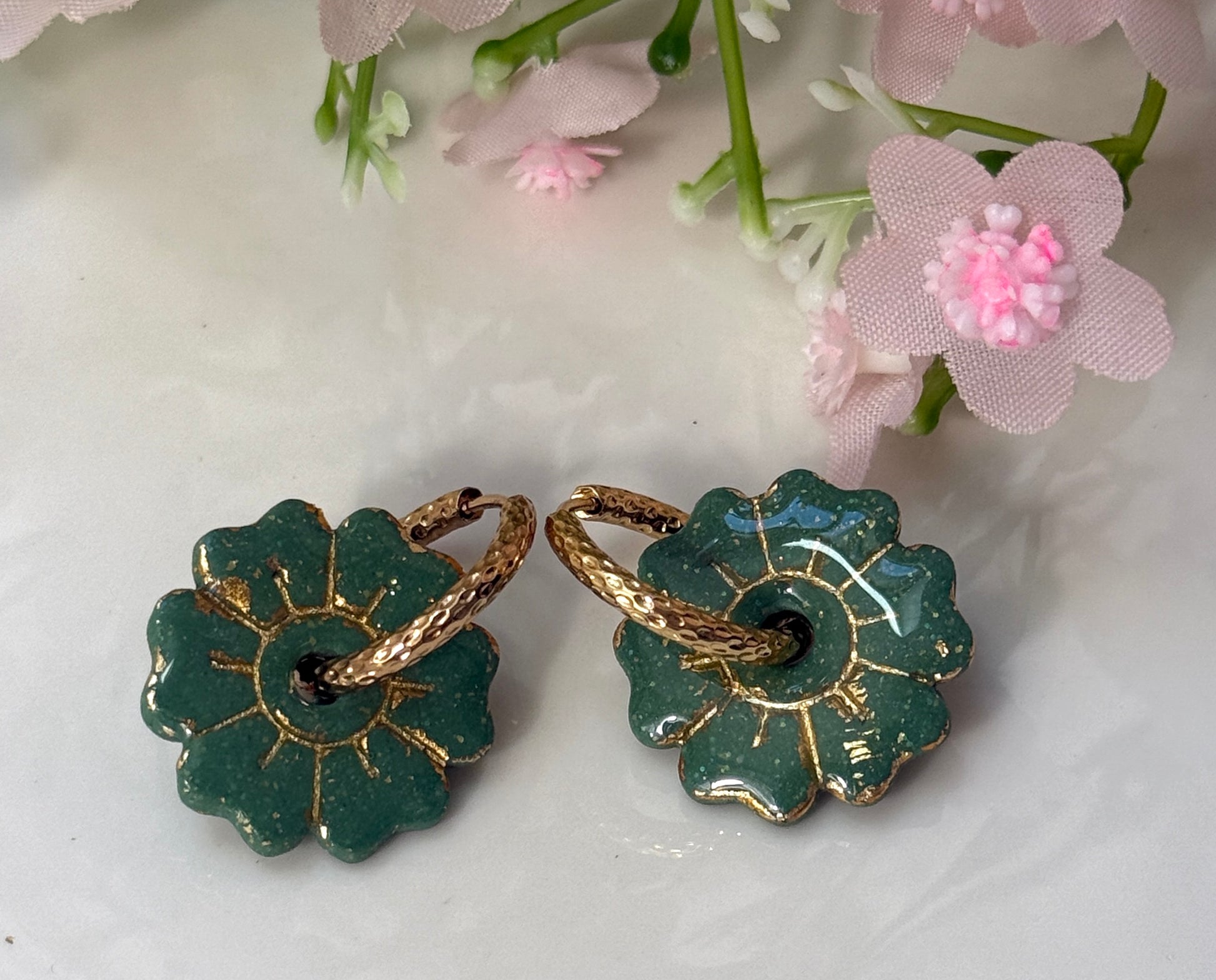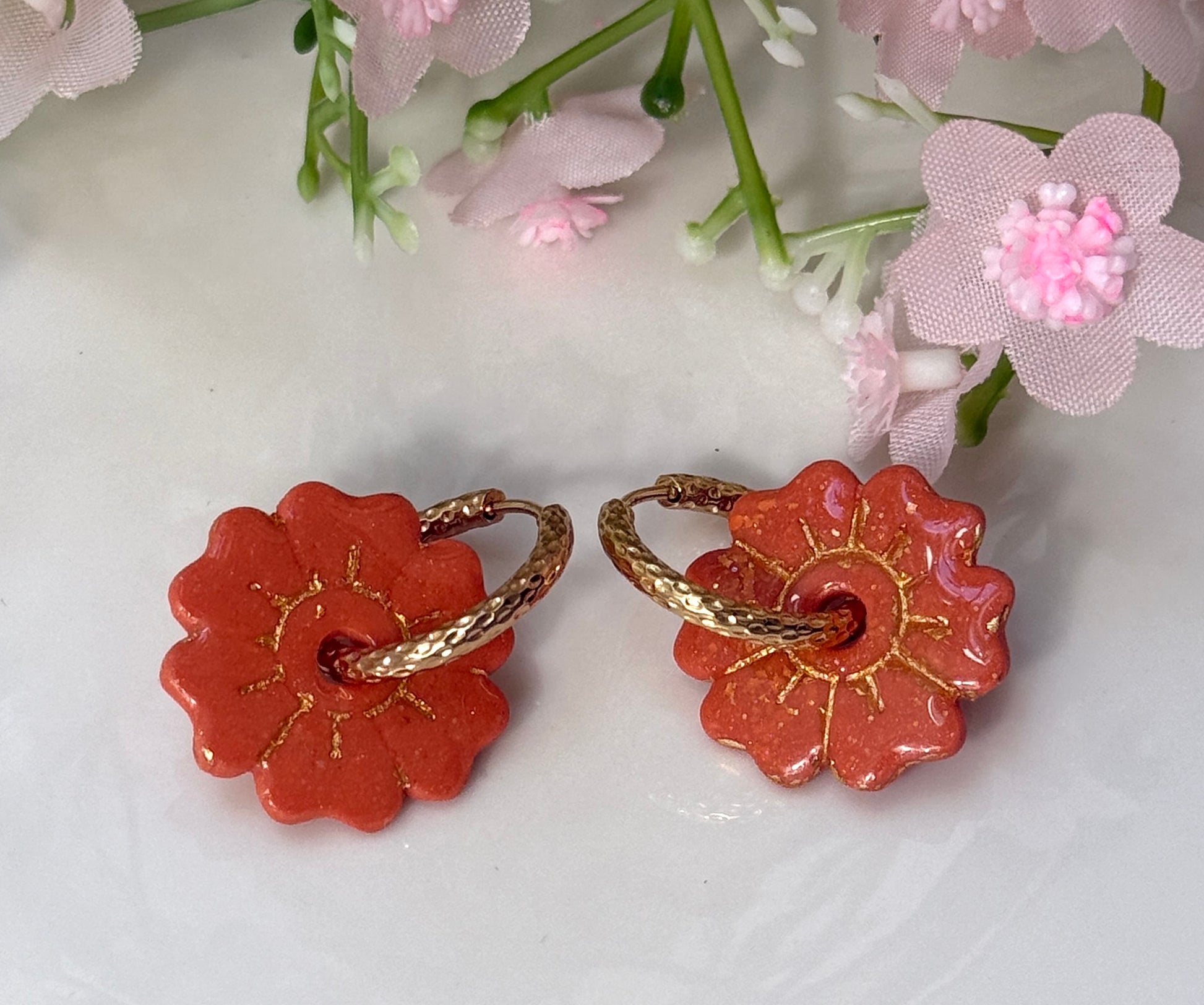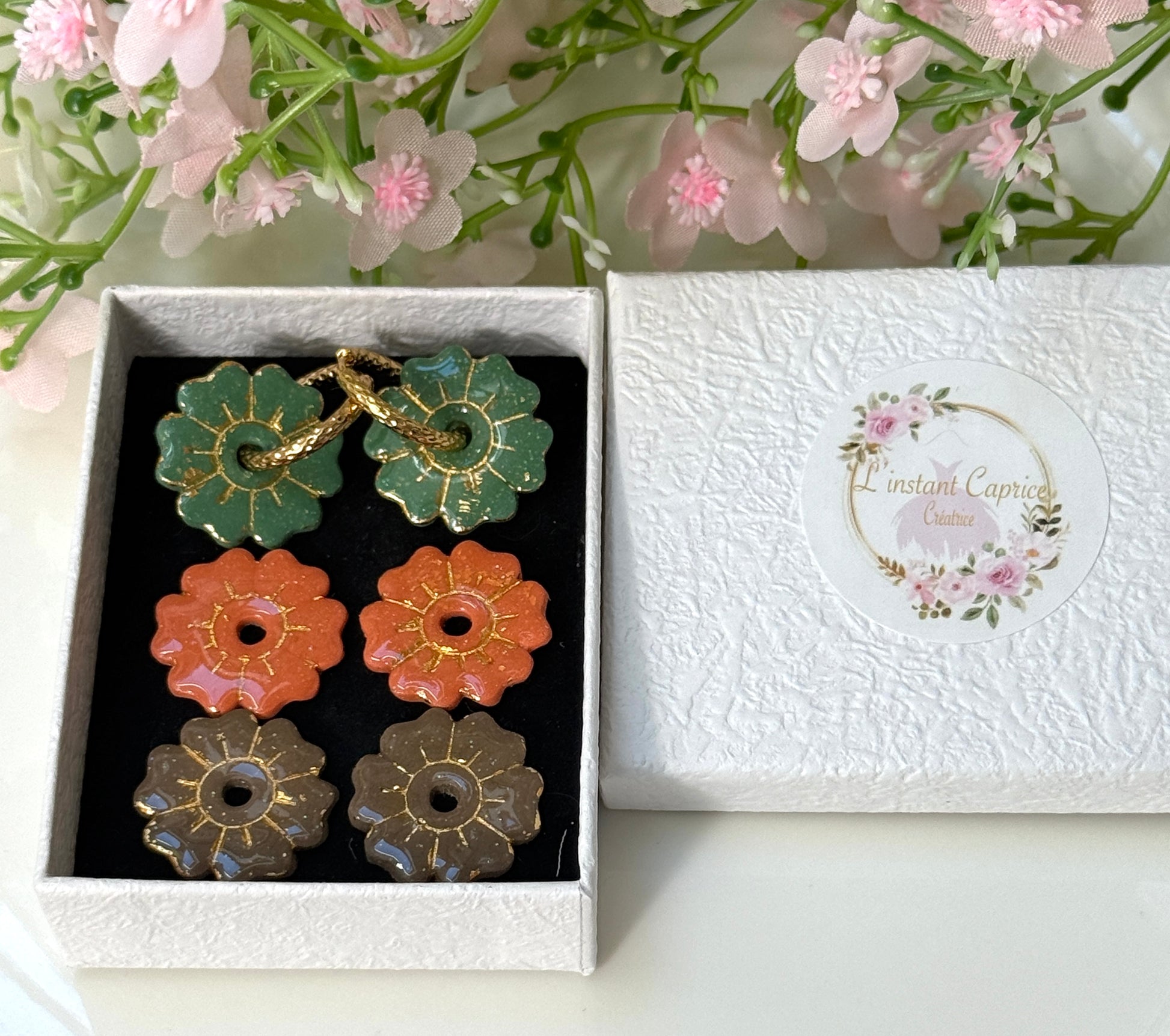 Celle-ci est une boxe au couleur d'automne, composée de trois paires de breloques doré à la feuille d'or, réalisées à la main en argile polymère, accompagnées d'une jolie créole en acier inoxydable mesurant 20mn de diamètre.
