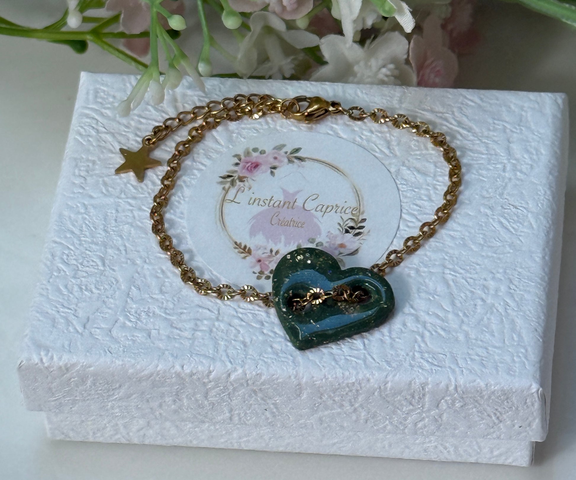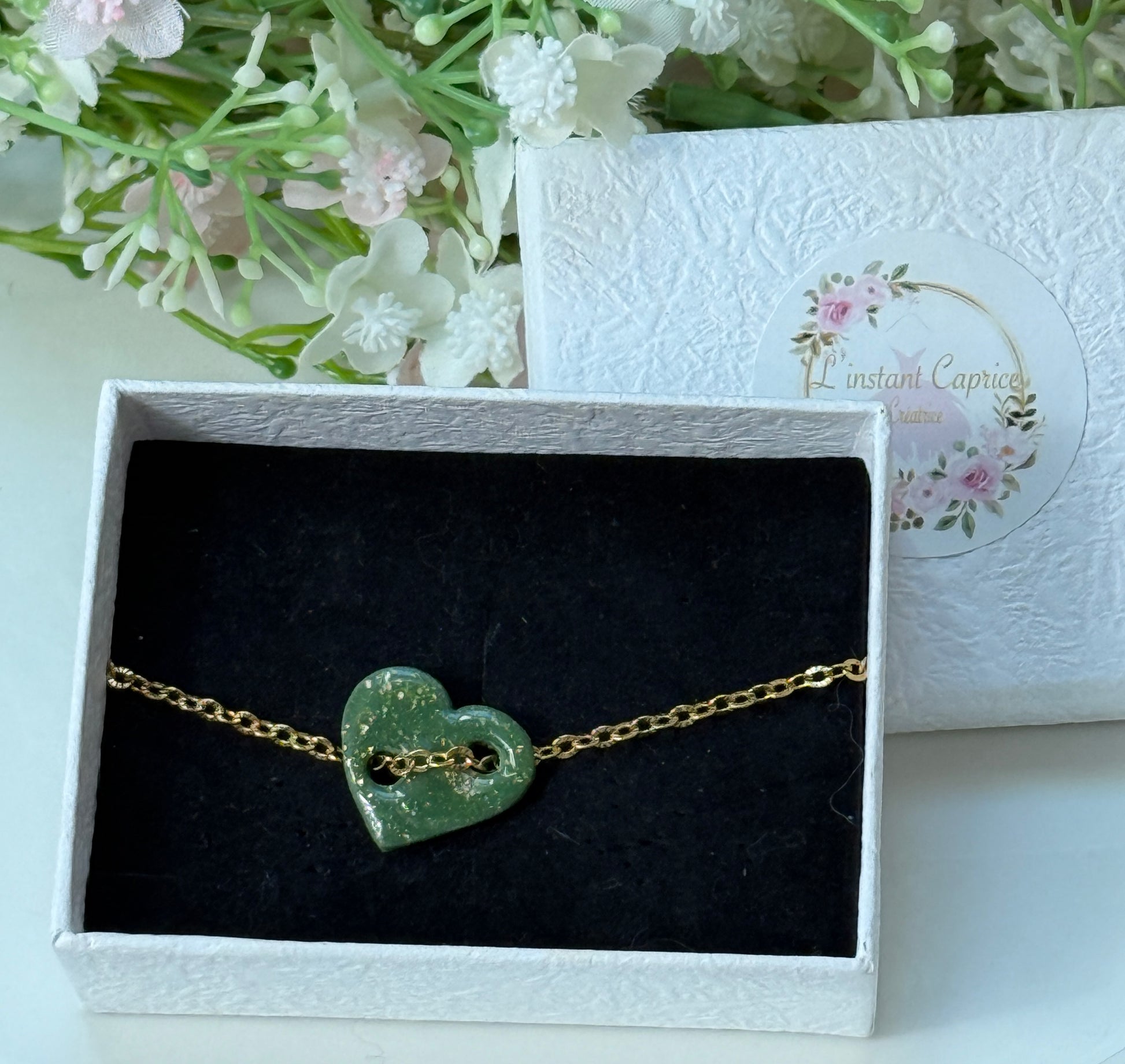 Le bracelet Mila est très original et à la fois raffiné, avec son petit coeur en argile polymère.