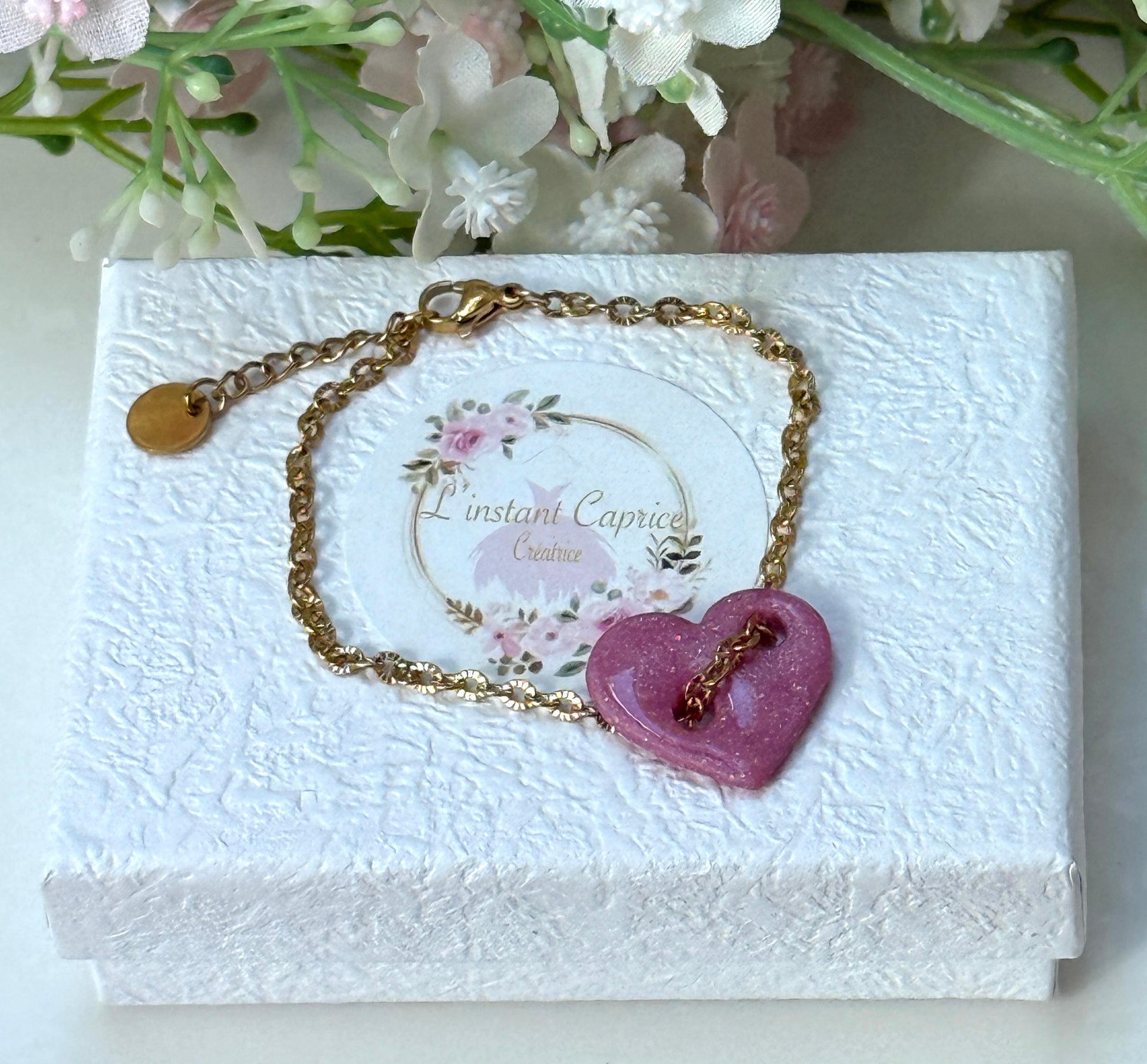 Le bracelet Mila est très original et à la fois raffiné, avec son petit coeur en argile polymère.