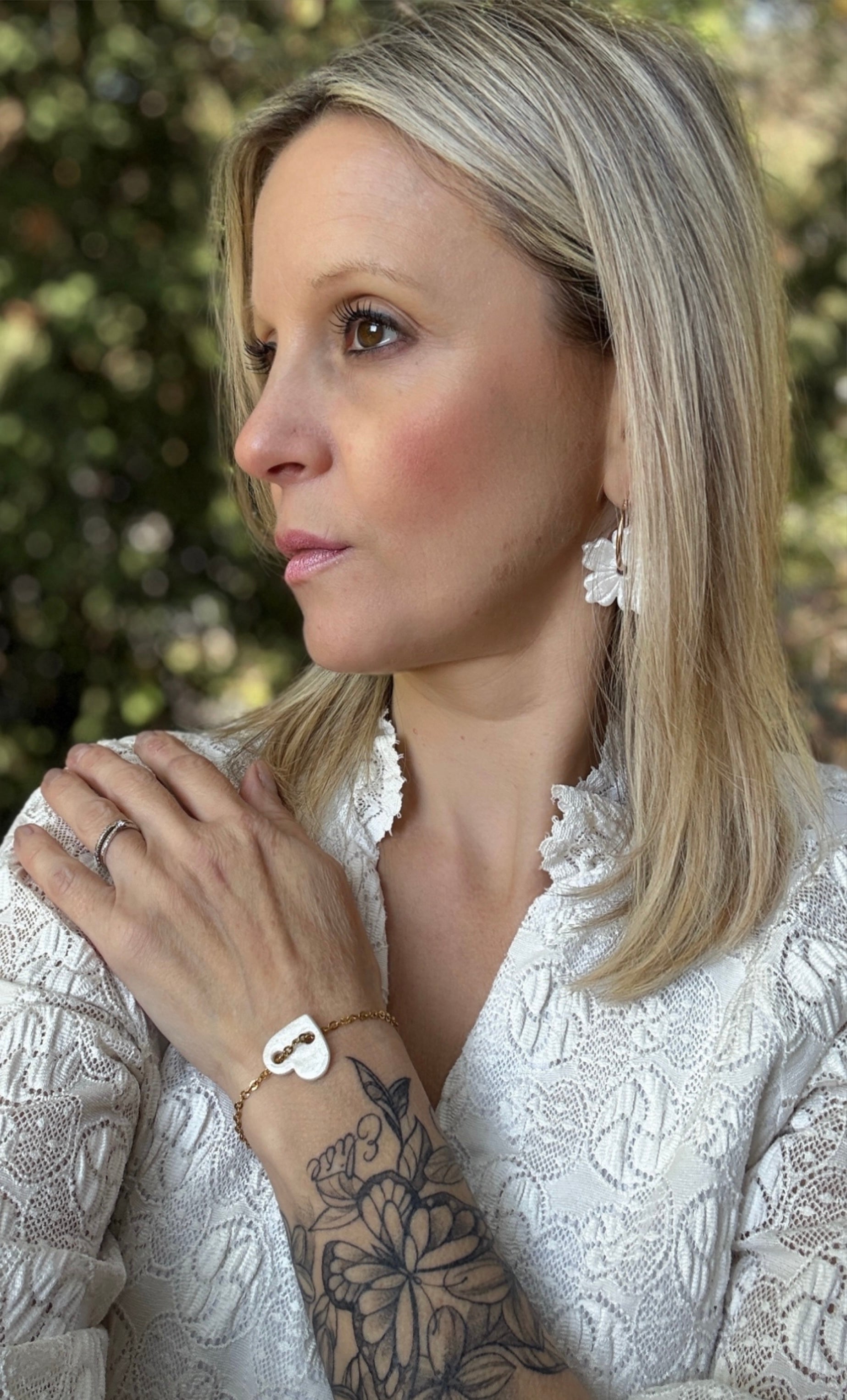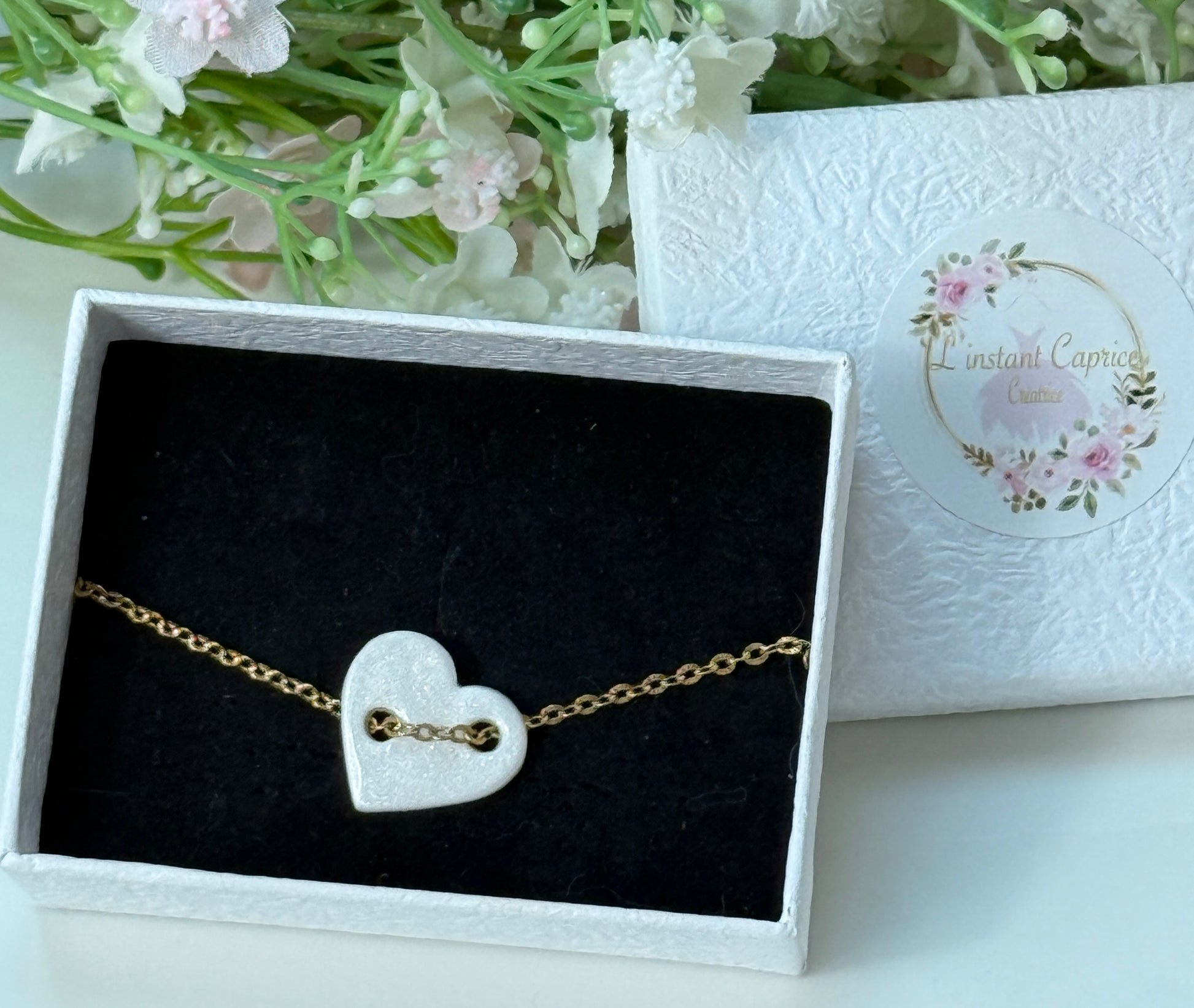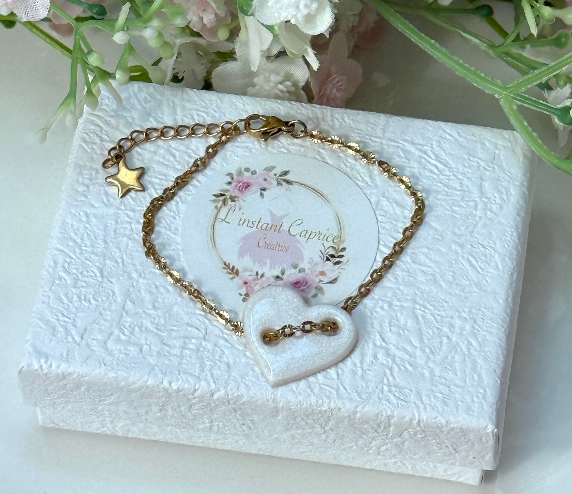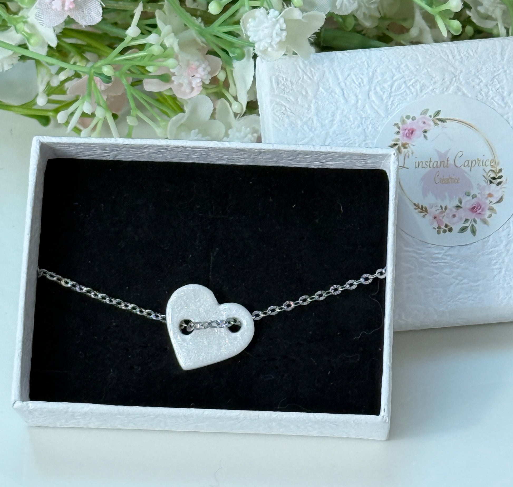 Le bracelet Mila est très original et à la fois raffiné, avec son petit coeur en argile polymère.