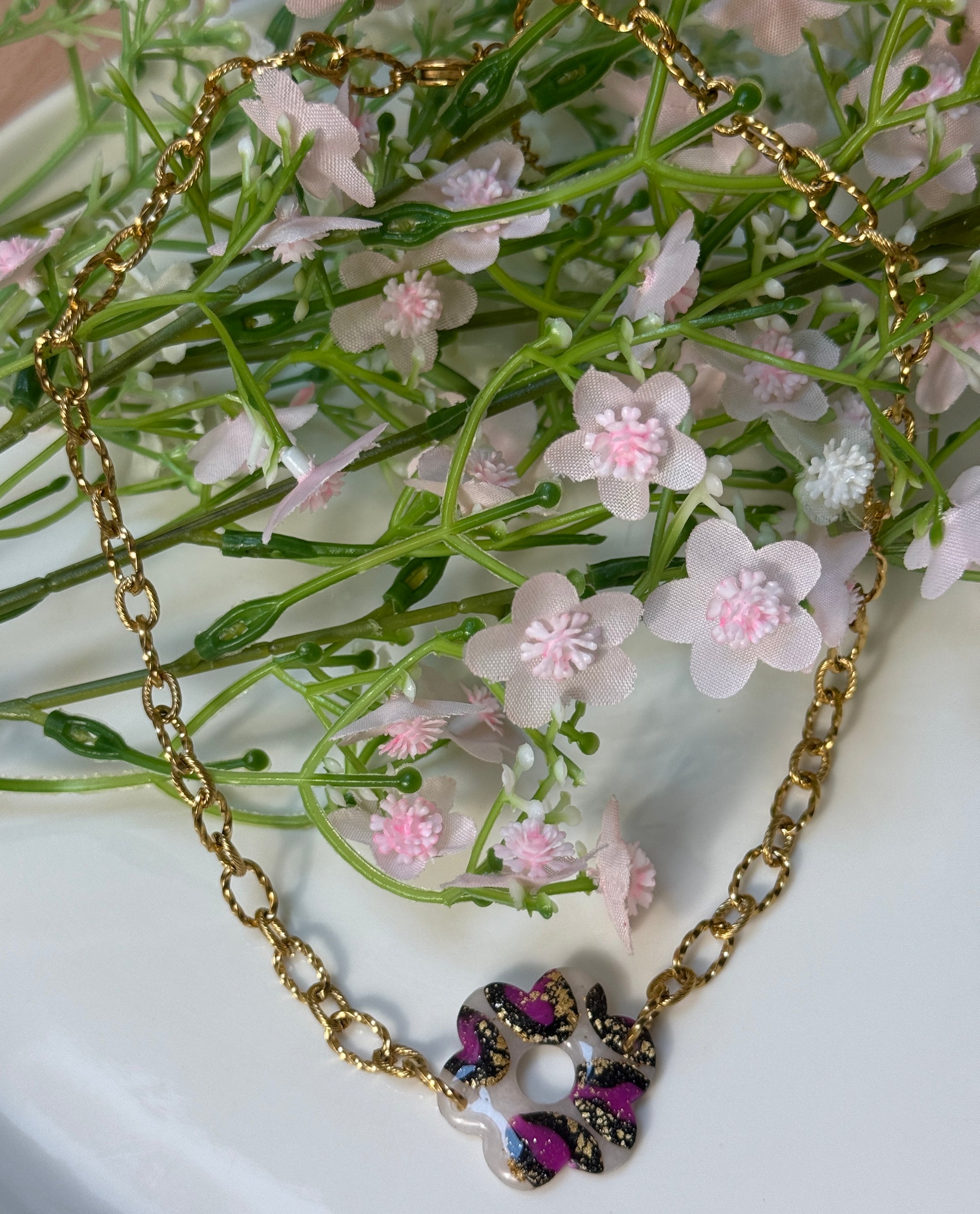 Le collier Dilys est orné d'une petite fleur de 30mn de diamètre en argile polymère, façonnée à la main.