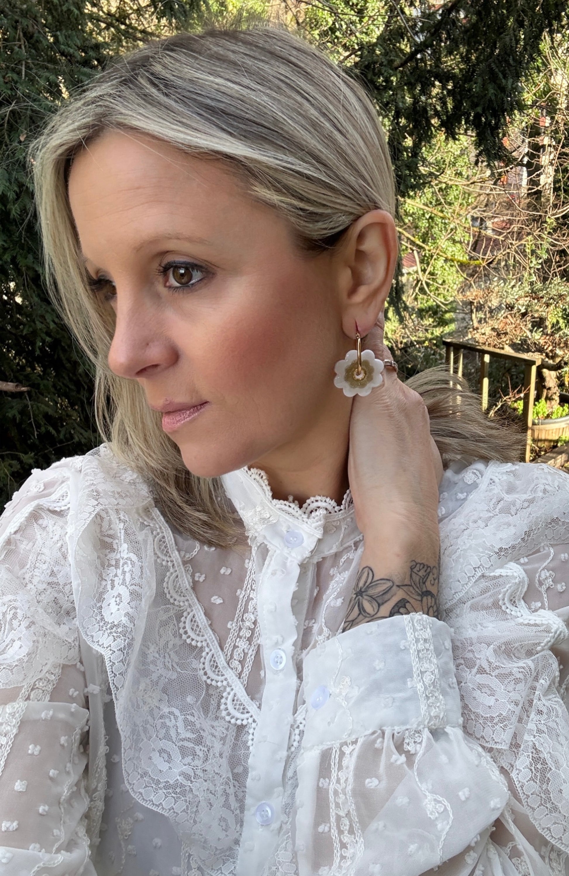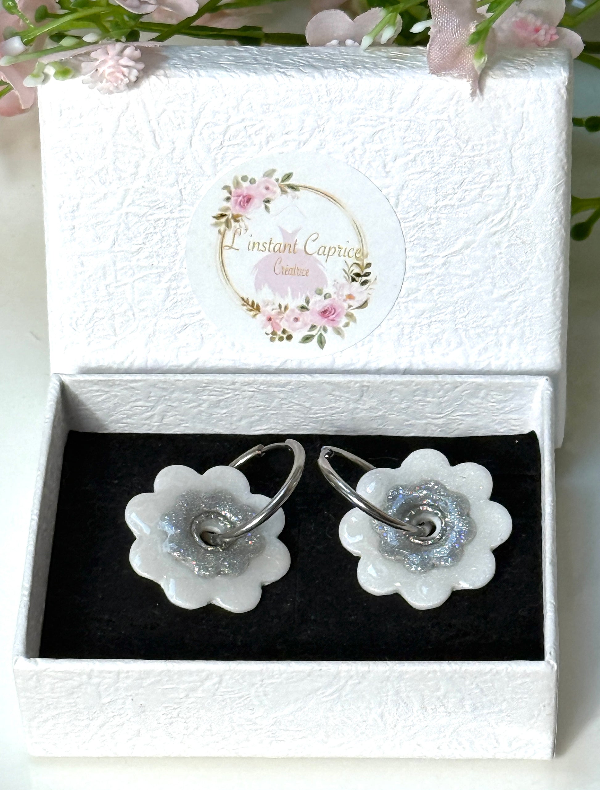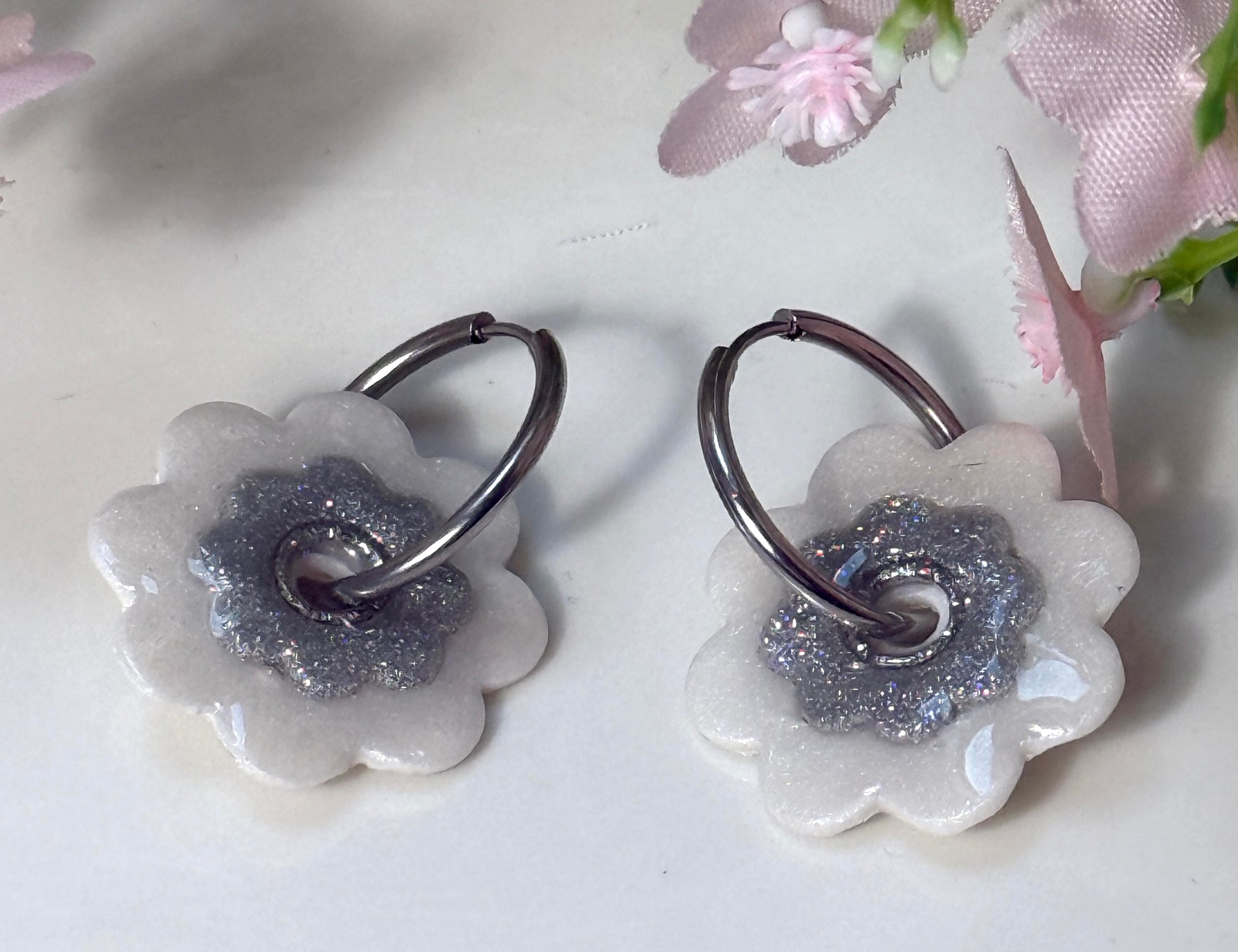 Celles-ci sont entièrement réalisées à la main en argile polymère et montées sur une créole en acier inoxydable.