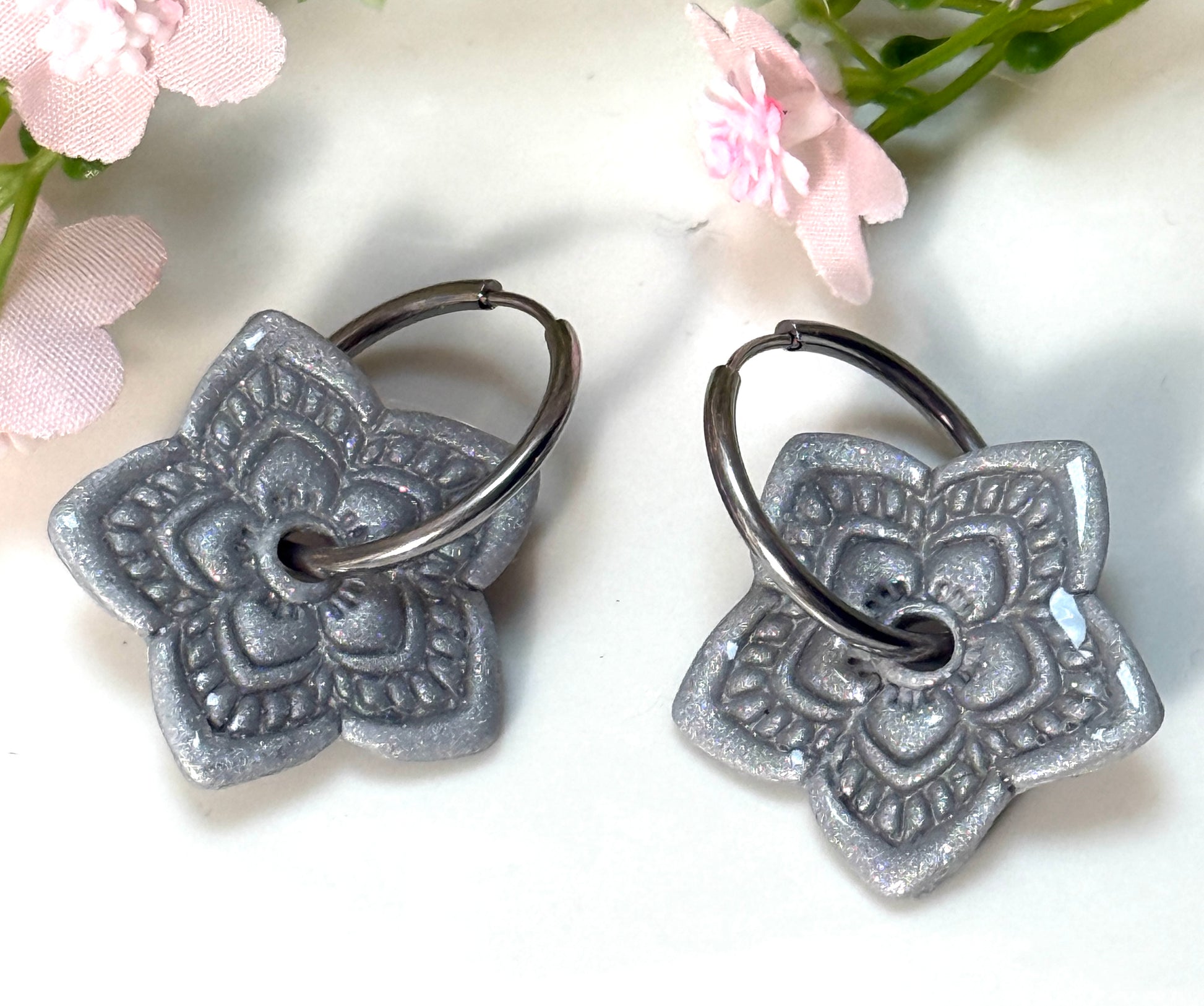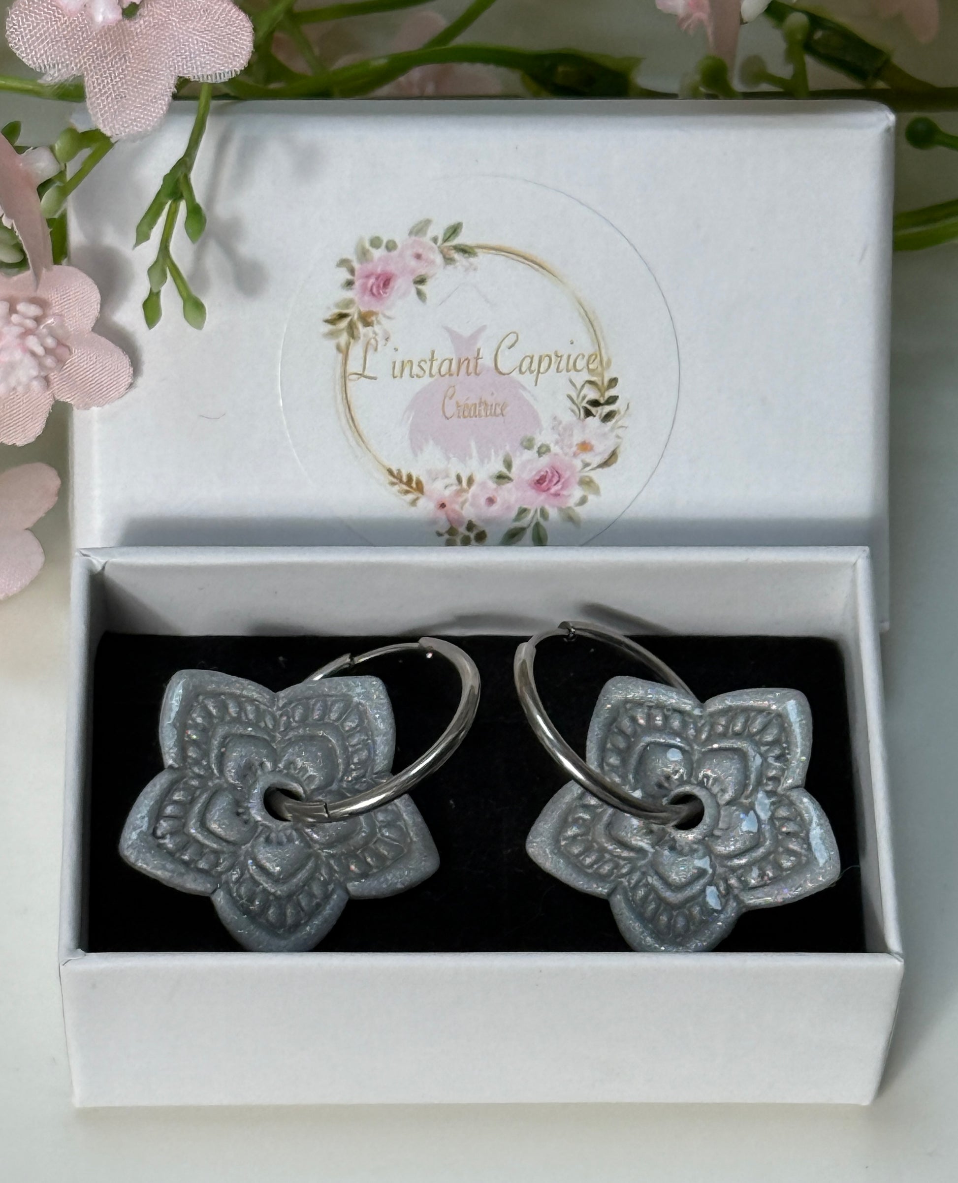 Celles-ci sont entièrement réalisées à la main en argile polymère et montées sur une créole en acier inoxydable.